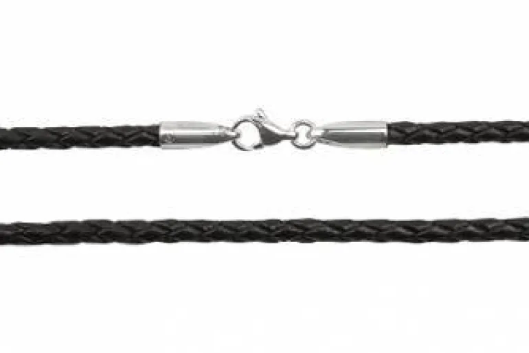Populær halskæde i sort flettet læder, med springlås i rustfri nikkelfri stål. Rigtig god og flot kvalitet.