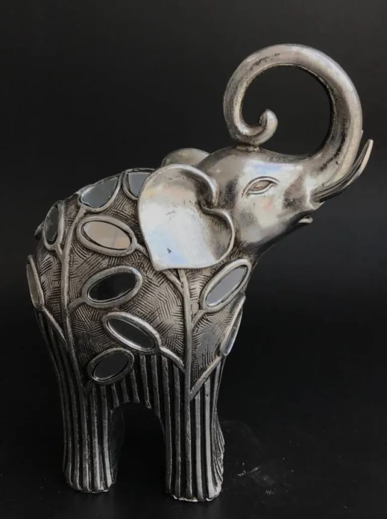 Speciel og abstrakt elefant figur i flot sølv finish med decor og små spejlstykker – 2 modeller i polystone materiale