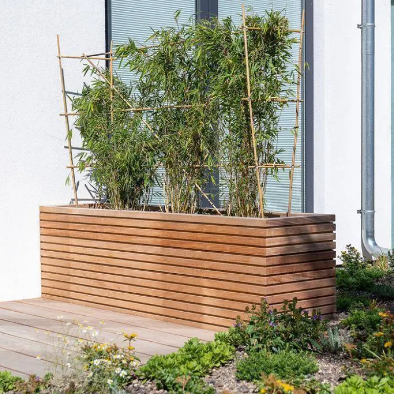 Disse udendørs plantekrukker i træ/hårdttræ kræver ingen vedligehold. Du kan med mellemrum give dem lidt klar træolie for at fremhæve strukturen i træet.