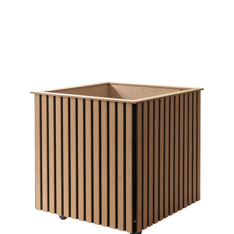 Krukkerne er lavet med base i spånplader og monteret med trælameller som absorberer lyd og samtidig fremstår i et varmt og moderne look.