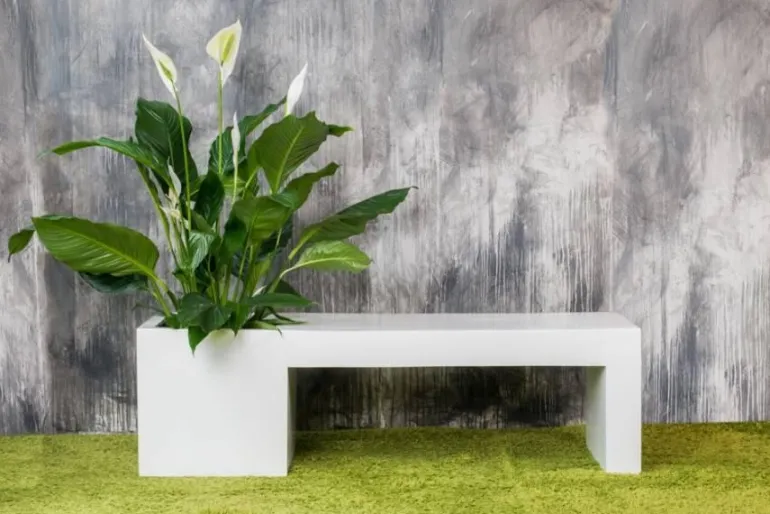 Praktisk og dekorativ bænk i hvid højglans glasfiber med indbygget plantekumme.