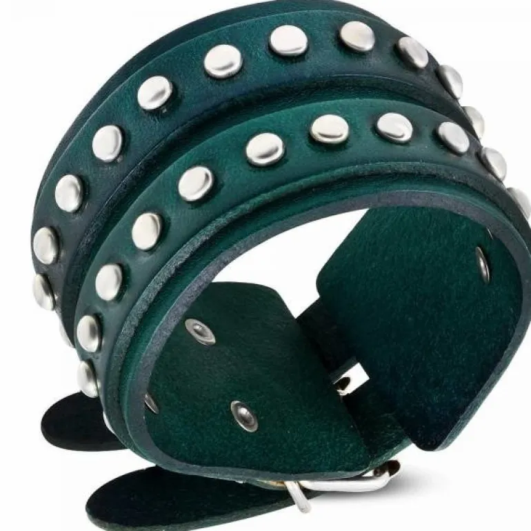 Fedt og flot bredt læderarmbånd med dobbelte spænder og nitter – både til kvinder og mænd der vil have fylde på håndleddet – fås i rød, petroleum og oliven.