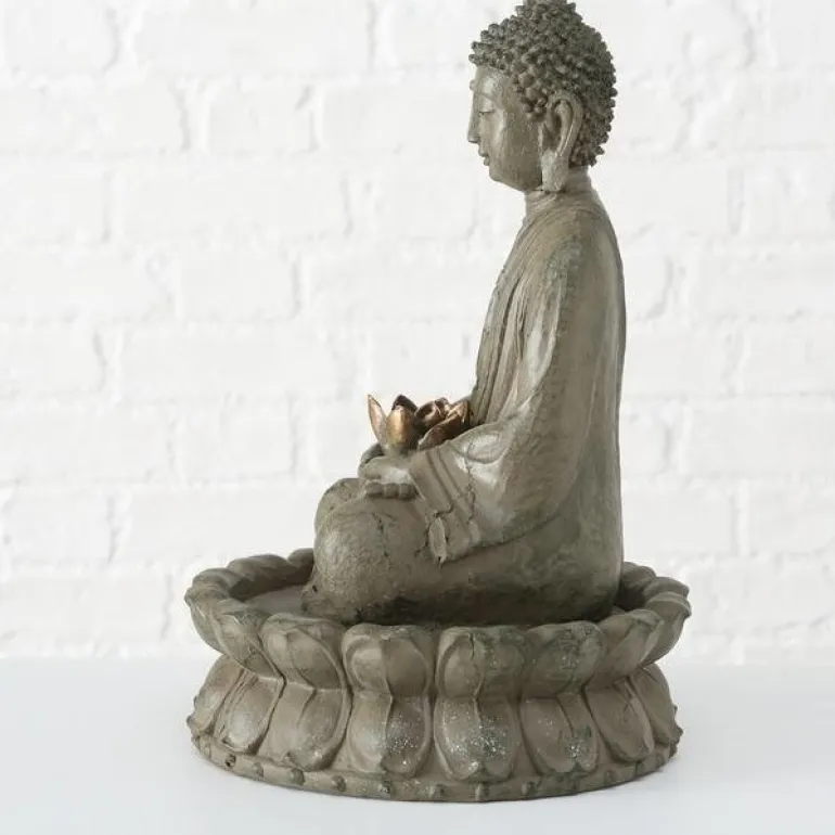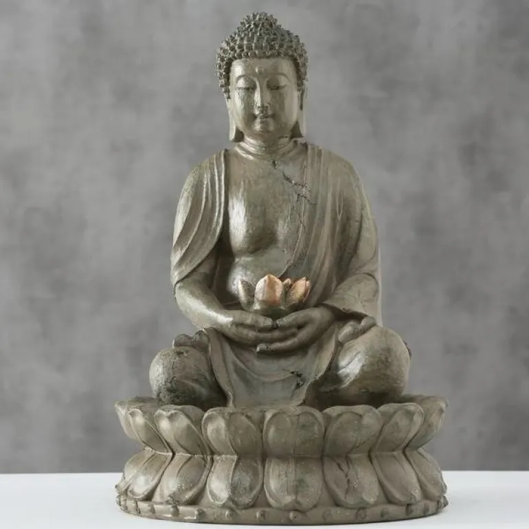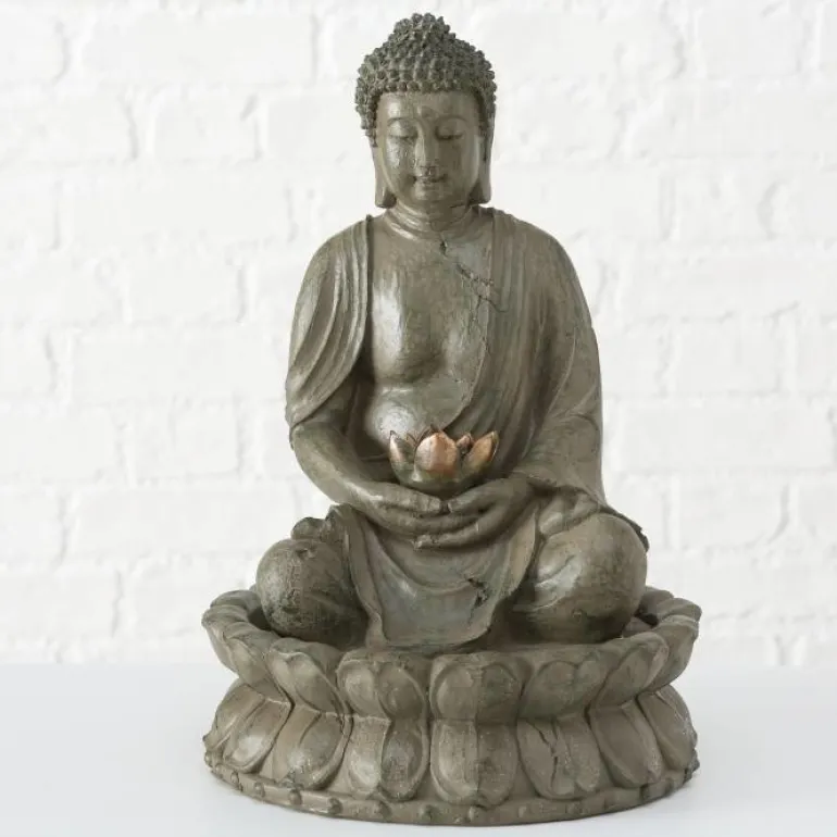 Flot og hyggelig vandkunst med Buddha figur og lotus blomst hvor vandet løber fra – kan anvendes både indendørs og udendørs (skal frostsikres om vinteren)