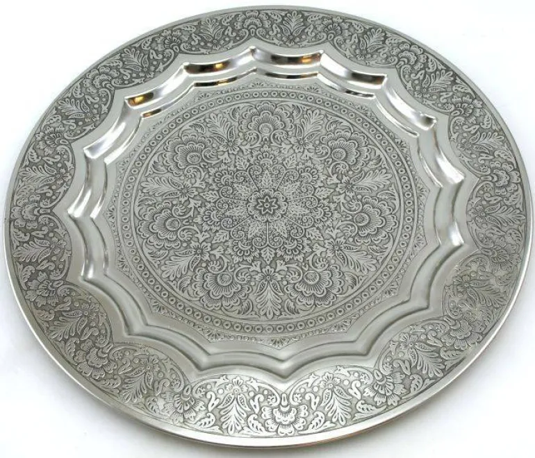 Flot Marokko fad med smukt mønster – orientalsk rundt fad til f.eks bloklys, frugt, og anden dekoration – også meget anvendeligt som serveringsfad til cocktails og drinks. Fremstillet i aluminium og højglanspoleret.