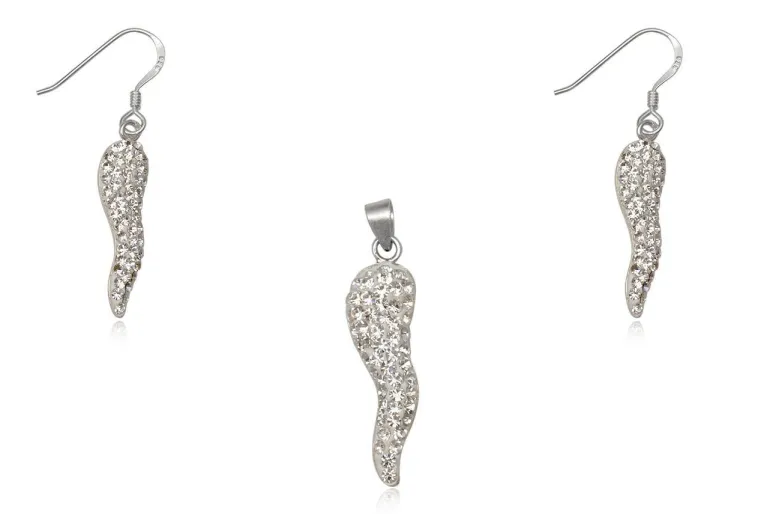 Flot feminint smykkesæt med øreringe og vedhæng i sølv – påsat klare krystalperler, så der er lidt bling til at fange opmærksomheden.