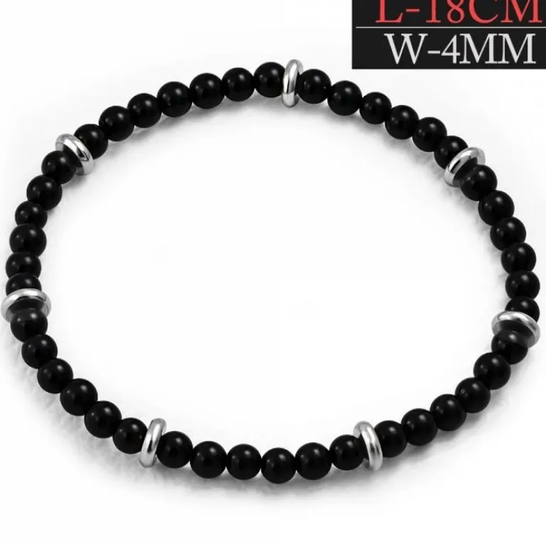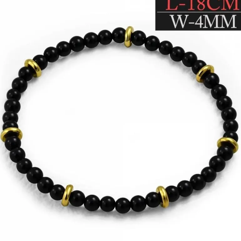 Elastisk armbånd med 4mm sorte agat kugler der er adskilt af fine charms i enten blank eller gylden finish.