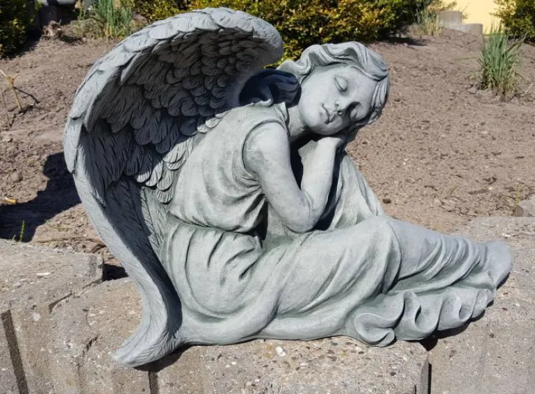 Stor smuk have engel i flot patineret beton – detaljeret og udtryksfuld sovende engel i frostsikker kvalitet.