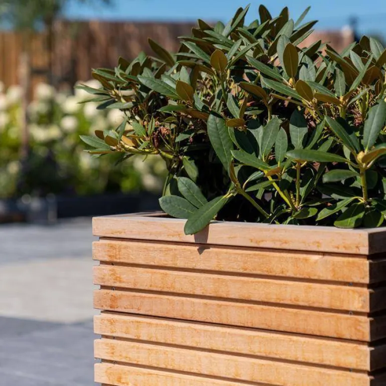 Disse udendørs plantekrukker i træ/hårdttræ kræver ingen vedligehold. Du kan med mellemrum give dem lidt klar træolie for at fremhæve strukturen i træet.