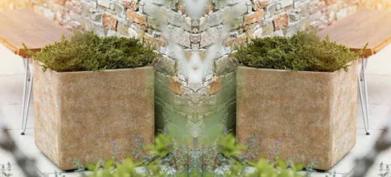 Firkantet udendørs frostsikker krukke i brunlig fiberstone med sandstruktur – 27×27 + 37×37 + 47x47cm