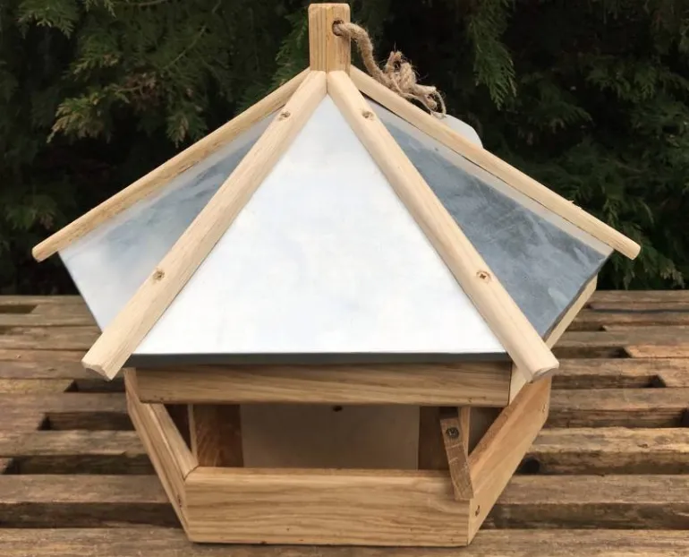 Super flot og holdbart 6 kantet fuglefoderhus i massiv egetræ – enten med bliktag eller antrazit tagpap – Ø.44cm