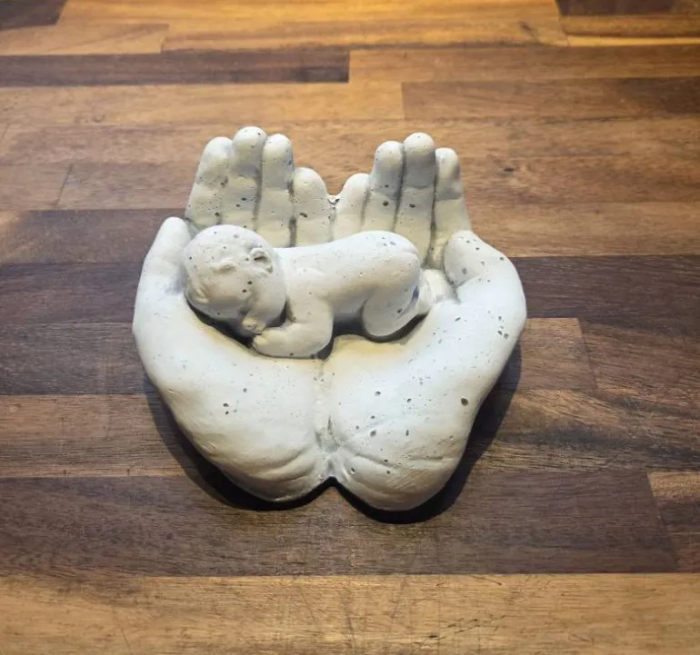 Fin lille skulptur med hænder der svøber en baby . ideel gave til f.eks barnedåb eller de nybagte forældre.