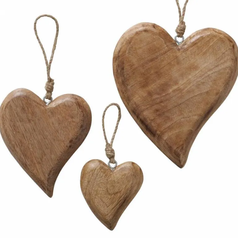 Fine træhjerter i mangotræ med hampesnor – sæt med 3stk