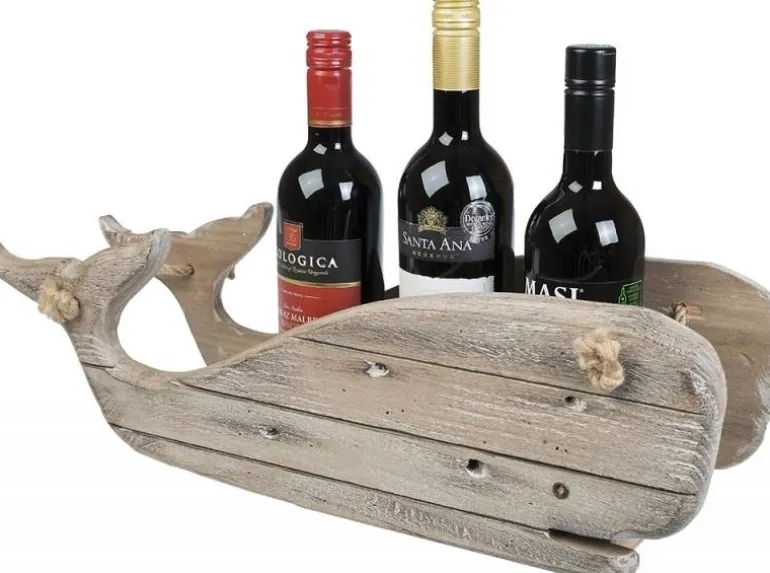 Anderledes og maritim rustik vinholder udformet som en hval i træ med tov – passer til 3 flasker vin. Præsenter dine vine på en sjov og speciel måde.
