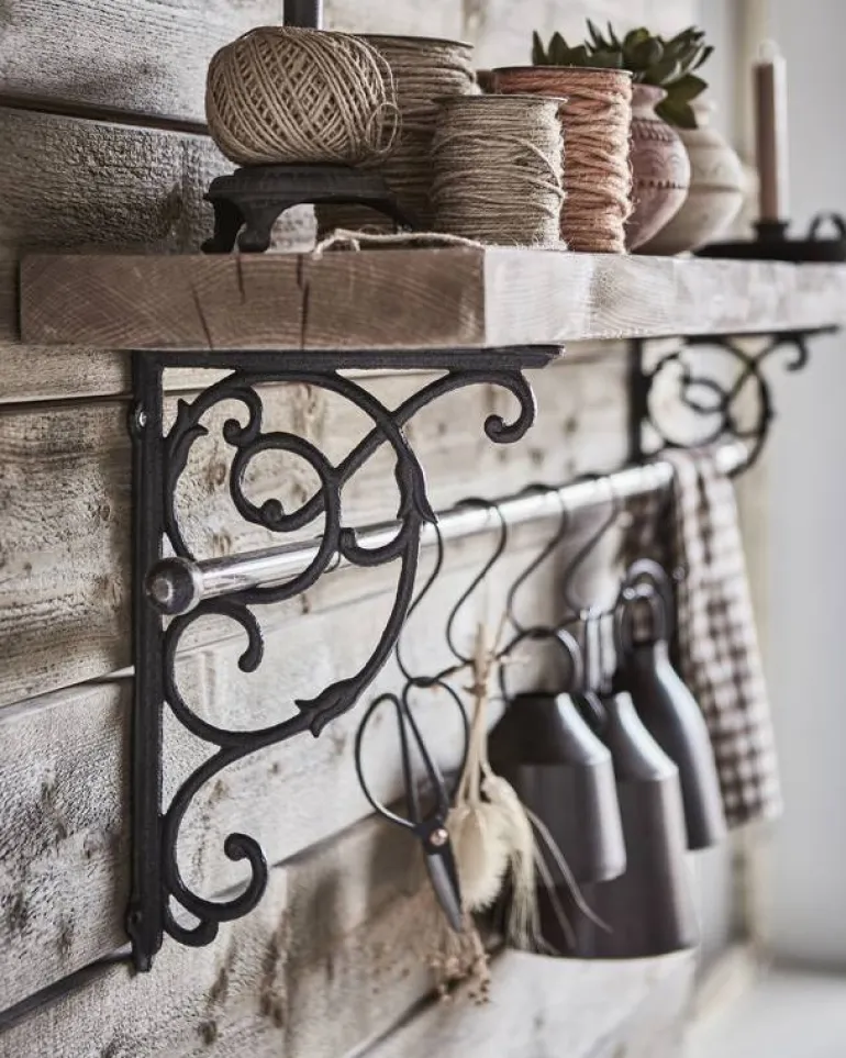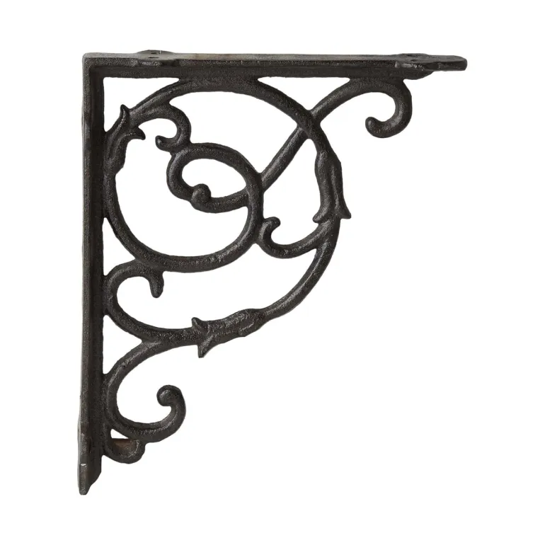 Nostalgisk og rustik hyldebærer i sort/brun støbejern med krummelurer.