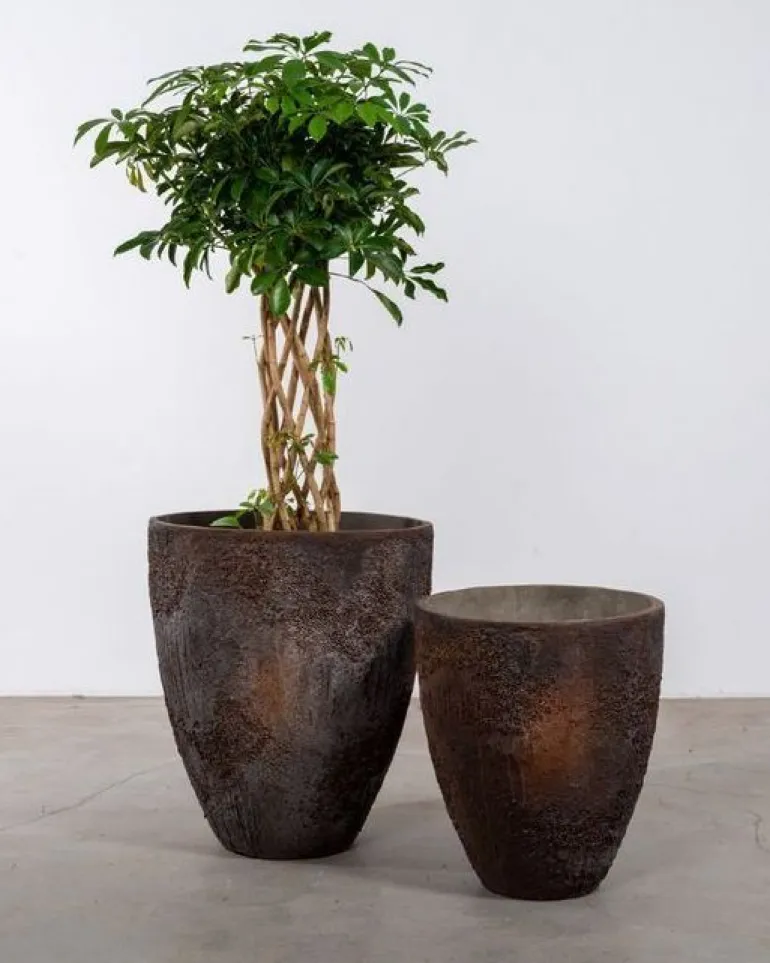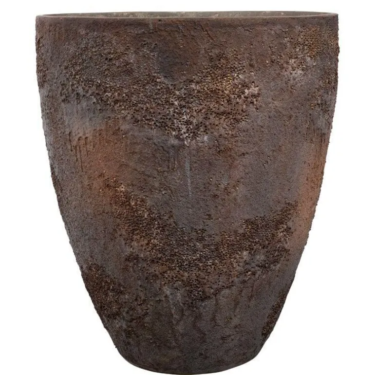 Helt speciel rustik stor konisk krukke med en helt fantastisk lavalook overflade – fremstillet i holdbar Fiberstone og kan rumme de helt store planter.