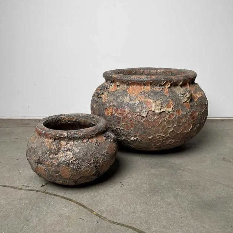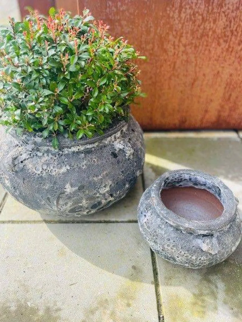 Unikt krukkesæt med 2 krukker i Oyster Sea look – let glasering på overfladen som fremstår både autentisk og meget rustik.