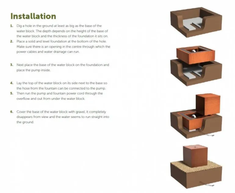Denne model er med ekstern vandkar som skal graves ned, så det kun er selve vandblokken der er synlig (du kan også vælge at sætte karret ovenpå jorden hvis du ønsker det) – Der medfølger et 2mm alu net som ligger rundt om fontænen til at tage fremmedlegemer. (Se billeder)