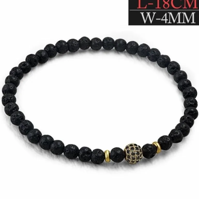 Eksklusivt elastisk armbånd med sorte lavakugler, gyldne spacere og centerkugle med sorte CZ sten. Fås i 2 tykkelser.