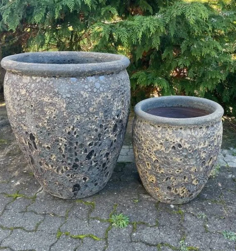 Lækre unikke frostsikre Krukker med en let glasering og et flot lava look overflade i light black finish – Leveres med bundhul til udendørs brug. Helt specielt rustik udtryk til både have og terrasse. Et mix af sand og sort gør dem anvendelige overalt. Alle krukker med denne finish er unikke og ikke 2 er helt ens !!