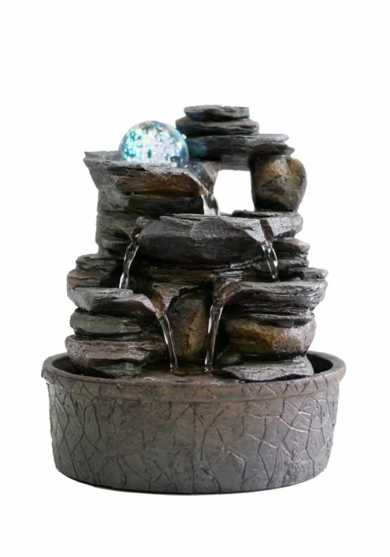 Hyggelig lille vandkunst / vandspil til indendørs brug med ledning, pumpe og LED lys – Formet som stenklippe hvor vandet risler ned af – øverst en rund roterende glaskugle.