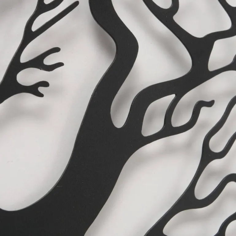 Pulverlakeret sort vægdekoration i metal med livets træ som tema – meget dekorativ og roligt udtryk til væggen udført som lasercut i metalplade.