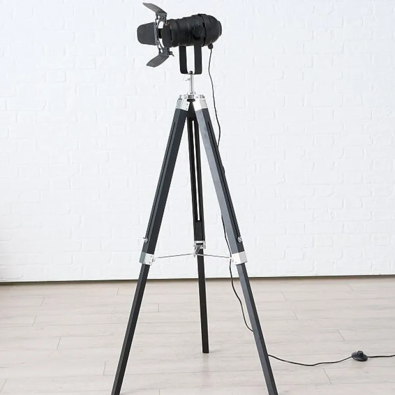 Super smart gulvlampe i instruktør stil – Tripod med 3 justerbare sorte ben i baltisk redwood og lampehoved i metal med skærme.