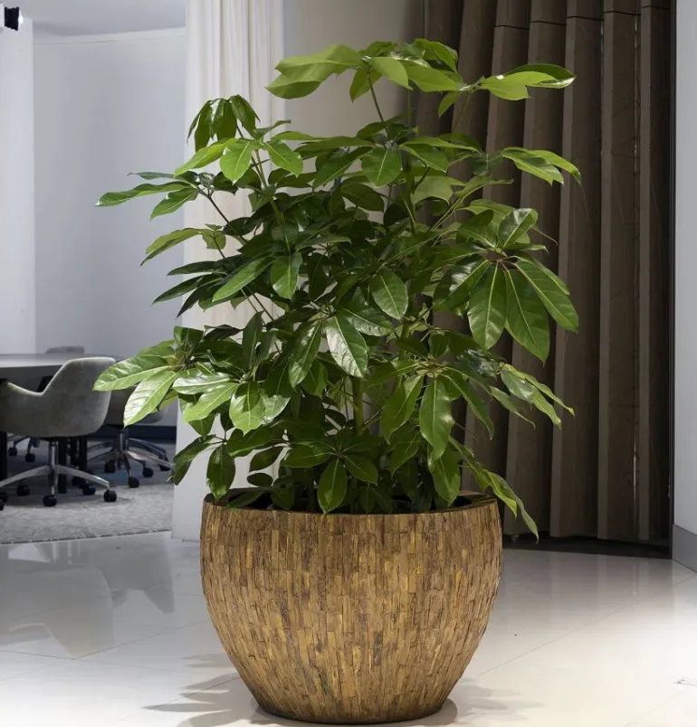 Eksklusiv og smuk rund krukke med Cemani træstykker udenpå. Disse krukker er kun til indendørs anvendelse og der skal anvendes planteindsats for at vandsikre krukken. Selve kernen i krukken er glasfiber. (Du kan evt sætte en anden vandtæt potte indeni hvis du ikke vil vandsikre den !!)