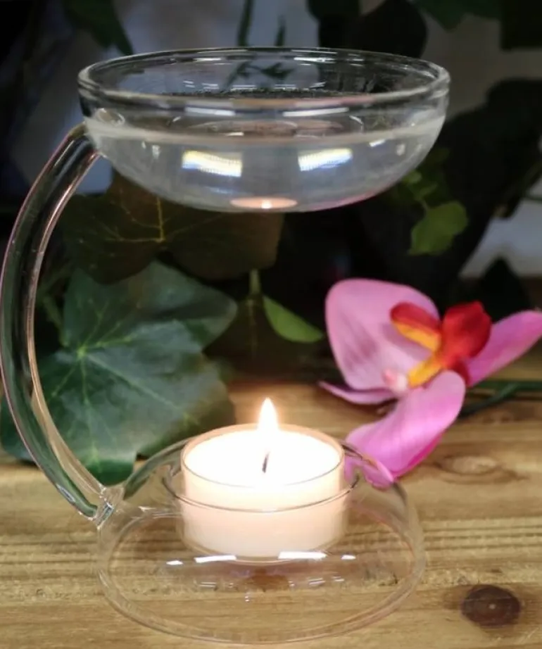 Stilren og enkel aromalysestage i glas til fyrfadslys – hæld vand i skålen og dryp nogle få dråber aromaolie i vandet og hyggen spreder sig.