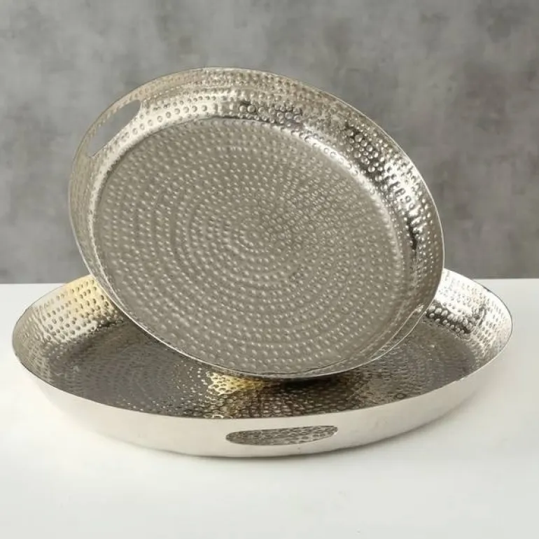 Flotte orientalske fade / serveringsfade med håndtag og banket mønster / silver/alu – Ø.40+Ø.50