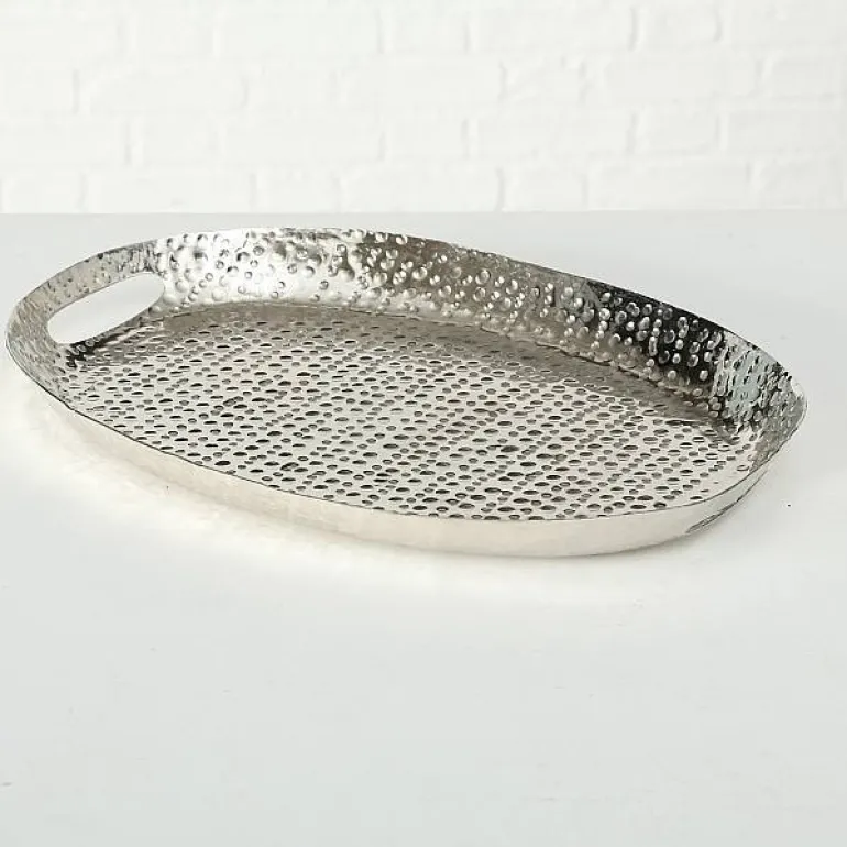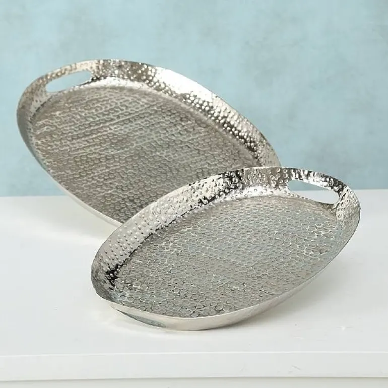 Aflange ovale fade til servering, dekoration eller bloklys – håndbanket mønster i højpoleret aluminium med håndtag.
