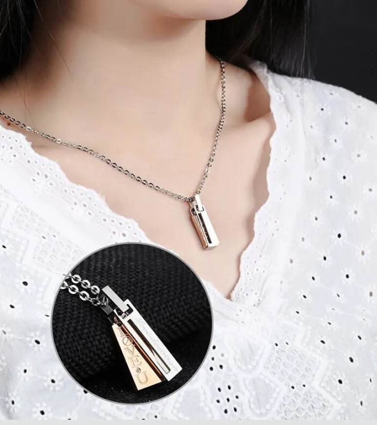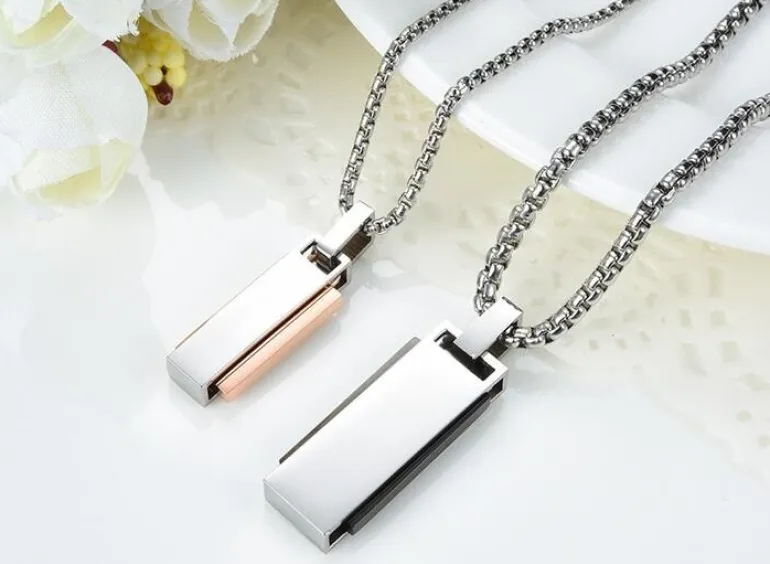 Stilede og moderne parhalskæder i rustfri nikkelfri stål med zirkon perle og tekst – hendes vedhæng er med gylden plade og hans med sort. Vis omverdenen at i hører sammen på flotteste vis.