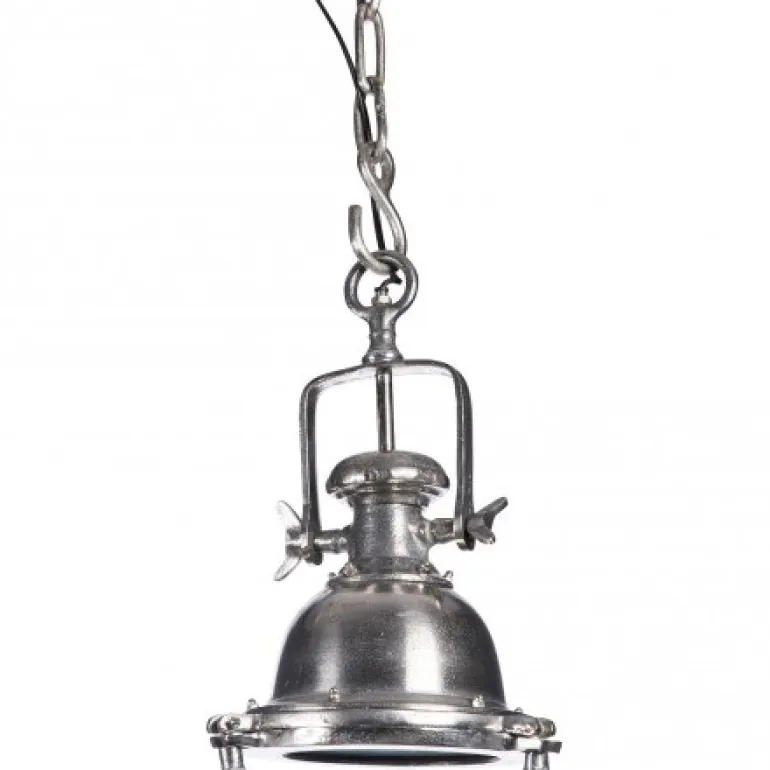 Super fed industrial loftslampe i helt rå aluminium med kraftig kæde og loftroset – god egenvægt.