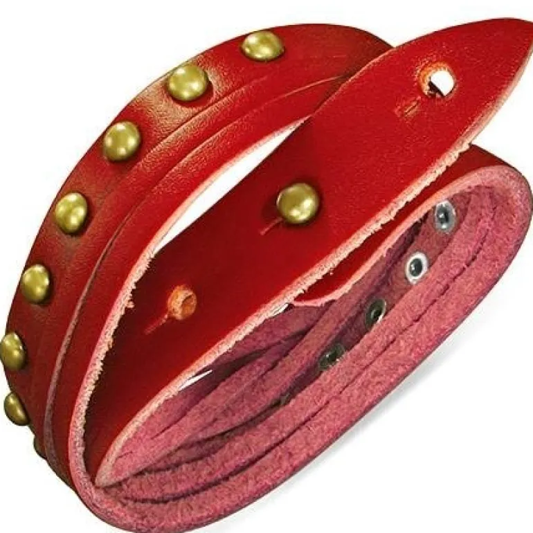 Wrap læderarmbånd i rød læder med messing nitter – dobbelt der snoes 2 gange rundt om håndleddet.