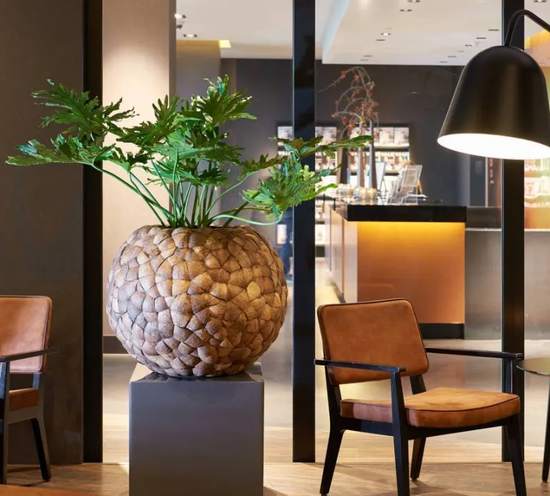 Eksklusiv og smuk rund krukke med coconut skaller. Disse krukker er kun til indendørs anvendelse og der skal anvendes planteindsats for at vandsikre krukken. Selve kernen i krukken er glasfiber. (Du kan evt sætte en anden vandtæt potte indeni hvis du ikke vil vandsikre den !!)