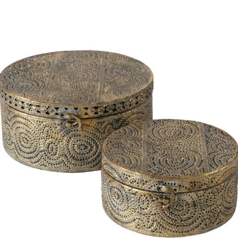 Runde orientalske opbevaringsdåser / bokse i perforeret gold antik metal med låg – sæt 2stk