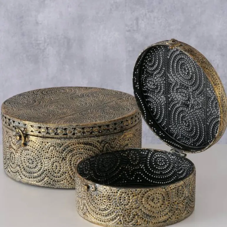 Virkelig dekorative orientalske runde dåser / bokse til diverse opbevaring eller til pynt – håndfremstillet i antik guld metal og vil pynte i ethvert hjem med hang til det etniske og rolige look.