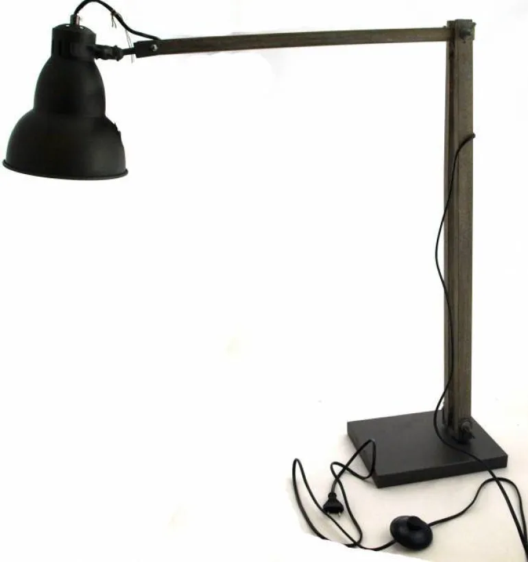 Fed og speciel gulvlampe i drivtømmerfarvet træ og antrazit grå metalskærm