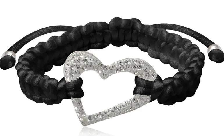Flettet sort silkesnor med sølvringe på snore og flot hjerte med base i sølv, påsat klare bling krystaller.
