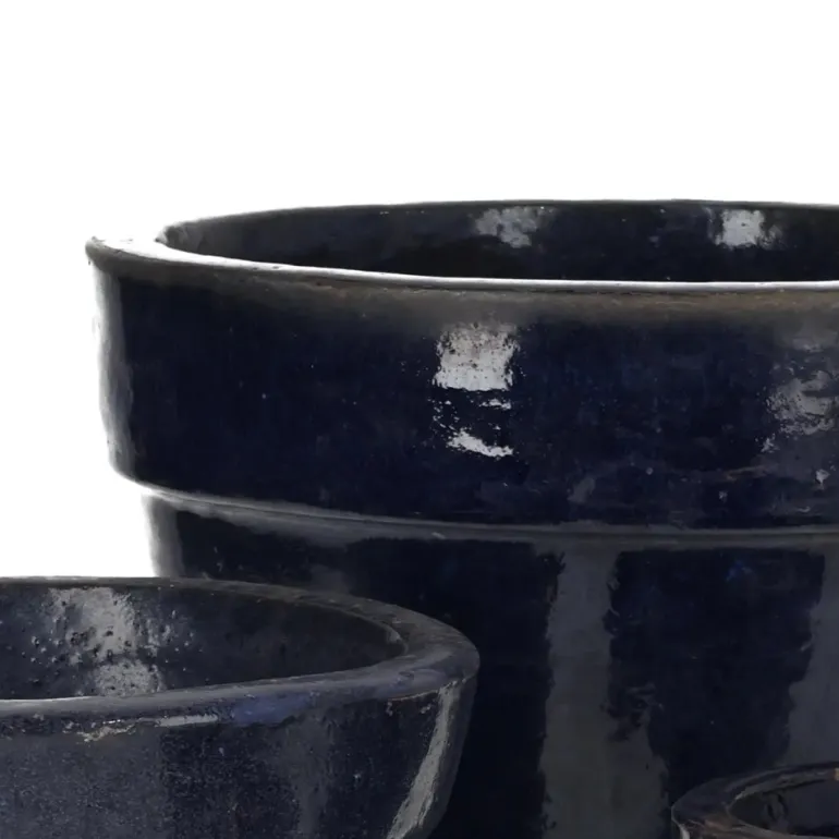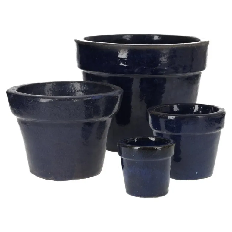 Krukkesæt i glaseret keramik med konisk form og bundhul – passende til altanen eller den lille terrasse. Kongeblå eller jadegrøn.