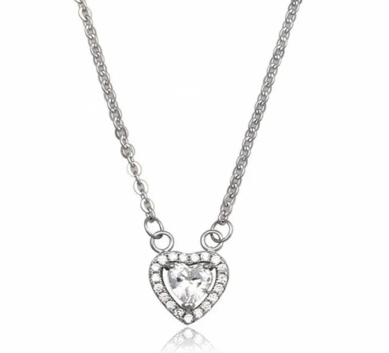 Fin komplet halskæde til hende med sølvkæde og hjerte i sølv med indfattet klar hjerte zirkon og små zirkoner rundt på vedhænget. Varen er rhodium belagt over 925 sølvet, hvilket får den til at ligne hvidguld og yder ekstra beskyttelse på smykket.