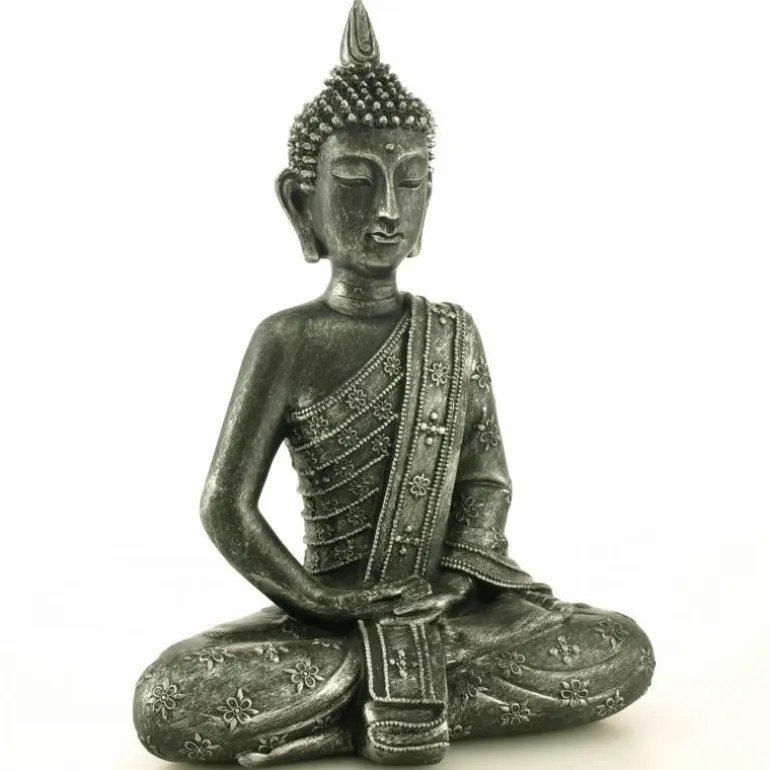 Super flot støvet antik sort/sølv finish i en god størrelse – siddende Thai Buddha figur med klæde og i lotus stilling. Fremstillet i polyresin.