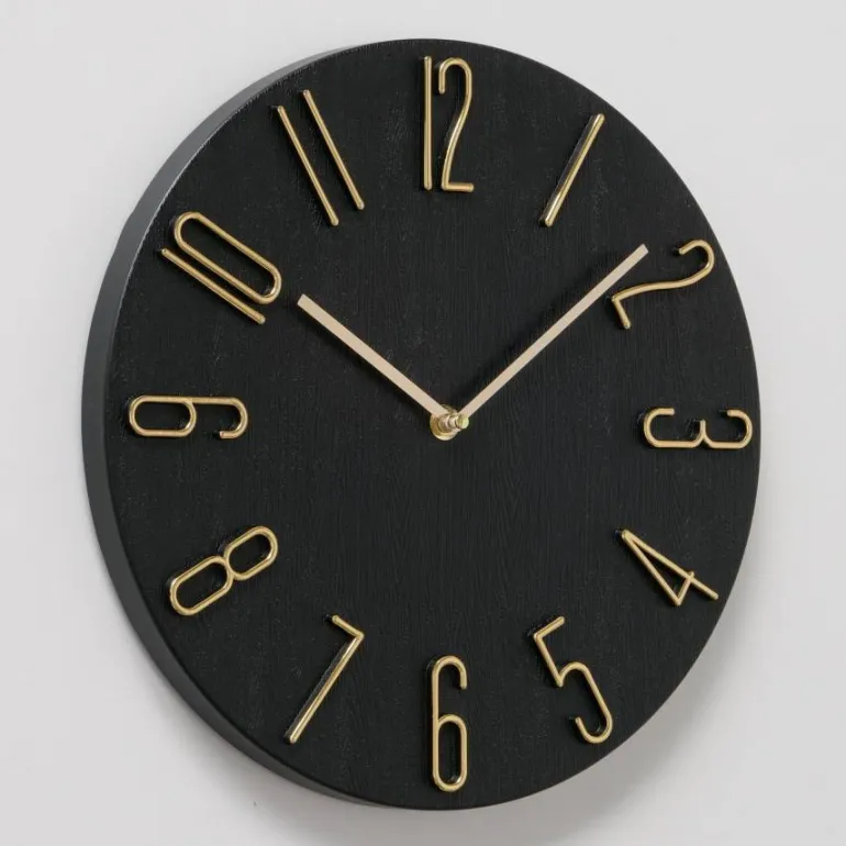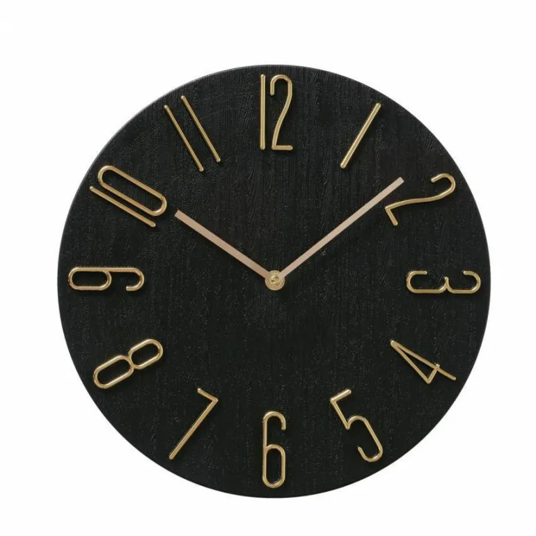 Vægur i sort polyresin med træstruktur og guldvisere og guldtal – Ø.30cm