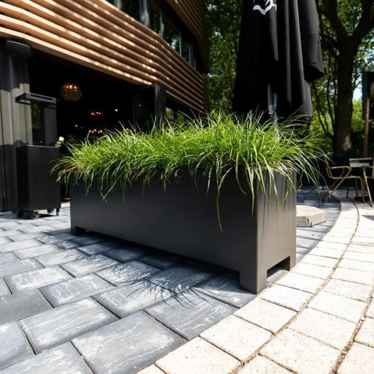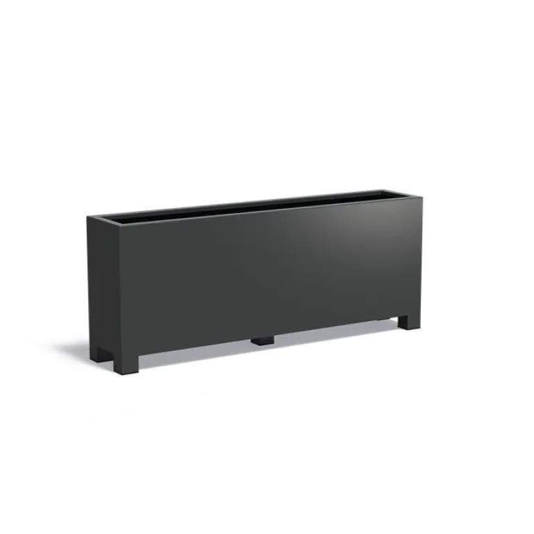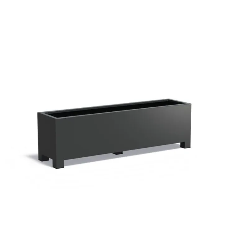 Store aflange rektangulære plantekasser i 7021 antrazit mat aluminium med 9cm ben / fødder så de kan flyttes med palleløfter.