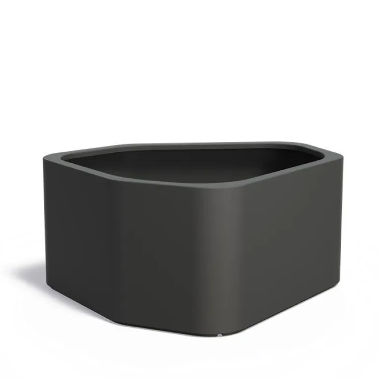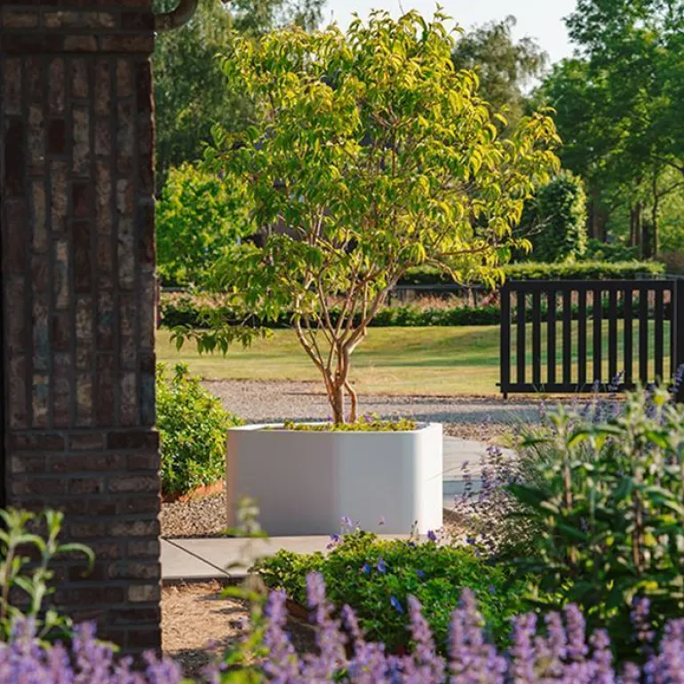 Store flotte organiske og abtrakte 6 kantede plantekummer i mat glasfiber – 3 farver – indendørs og udendørs.