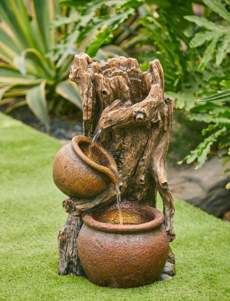 Flot og hyggelig vandfontæne udformet som en træstamme med 2 vandpotter – der er LED lys i hver potte. Lukket recirkulerende vandsystem.