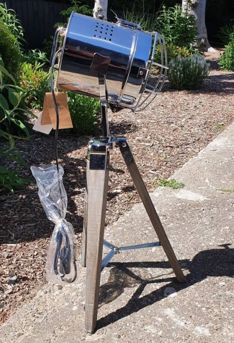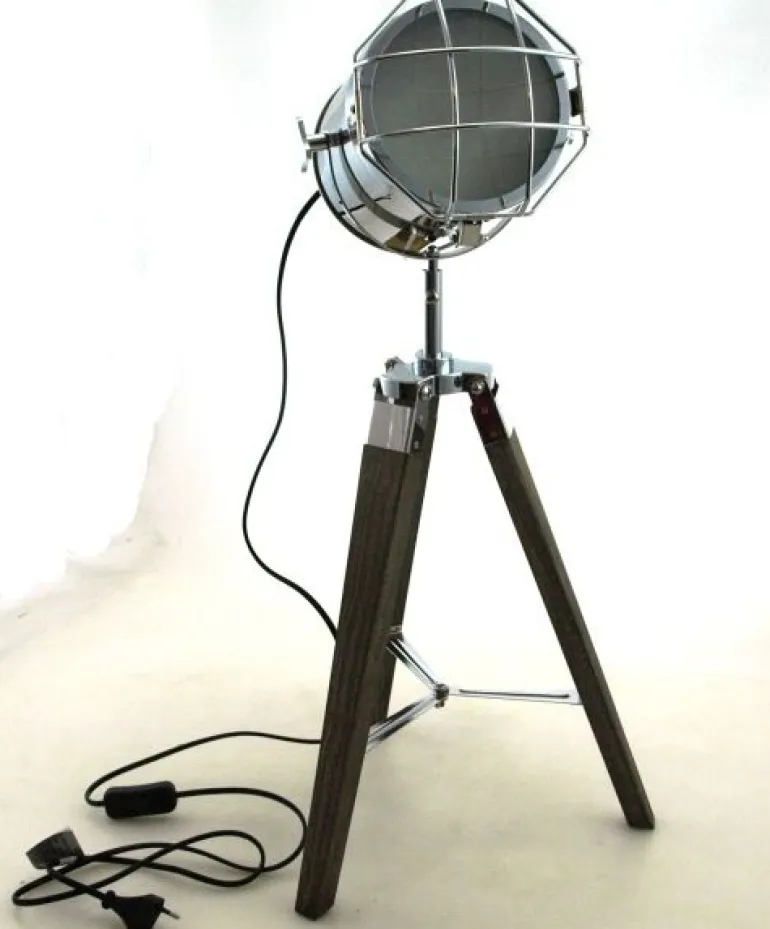 – på tripod træben og i det fede industri studio look – speciel bordlampe med et råt udtryk med projektørhus i blank metal.