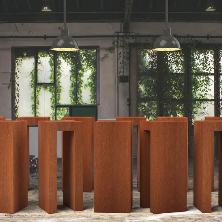 CorTen anvendt her, er en meget stærk 2mm stål/alu sammensætning som har den egenskab at det dækker sig selv med overfladerust, som også er beskyttende imod direkte korrossion af materialet når de er placeret udendørs.