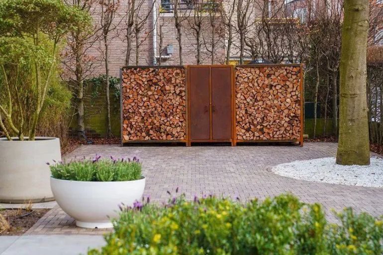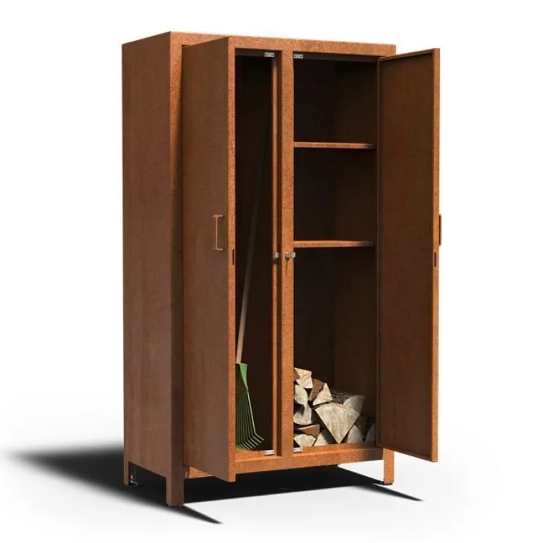 Udendørs skab i cortenstål til redskaber, brænde mv