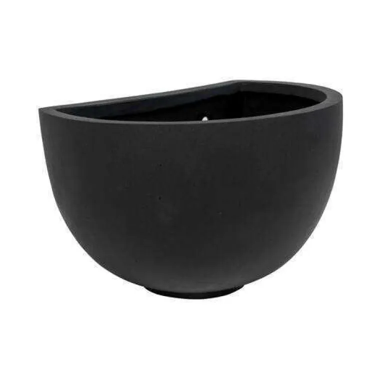 Rummelig og stilren halvrund blomsterampel til væggen i sort fiberstone, uden bundhul – amplen er vandtæt, men vi anbefaler at du forer den med plast for at være på den sikre side, hvis den skal bruges indendørs.