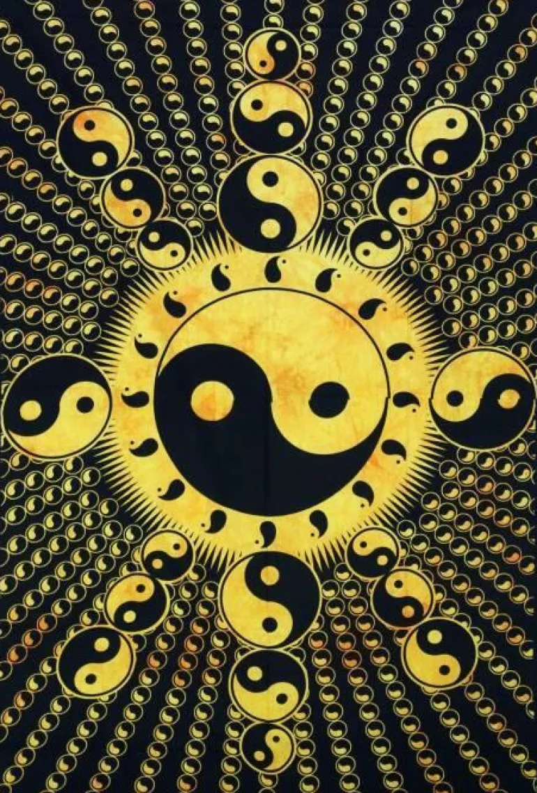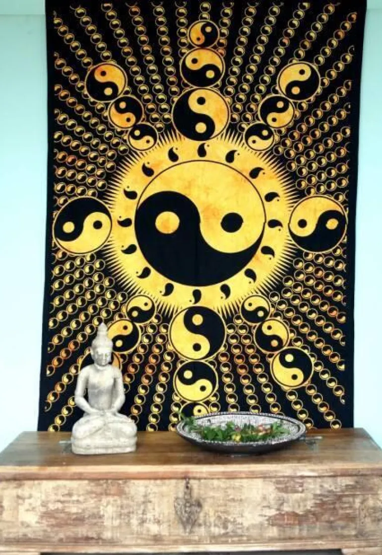 Flot dekoration til din væg, her med et fint vægtæppe med yin yang print – 100% fair trade fra Indien. Kan vendes som du har lyst. Lækre farver i sort & gul brændt okker.